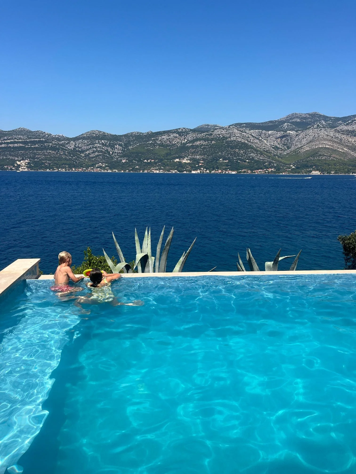 Two young girls on a balcony in front of the Eiffel Tower in Paris, France.